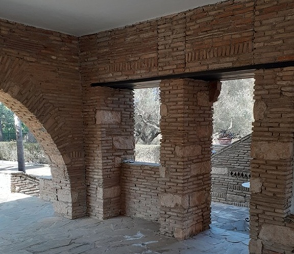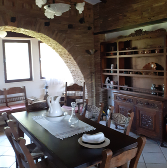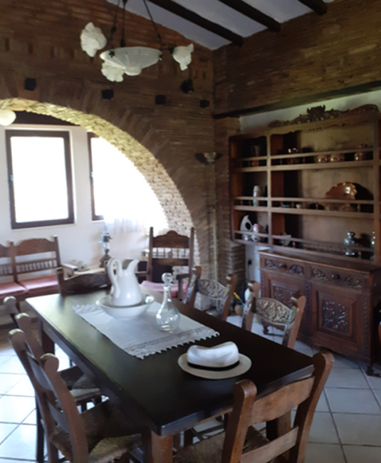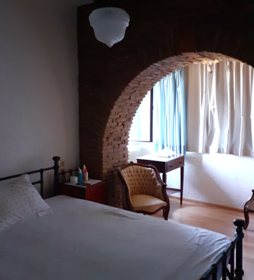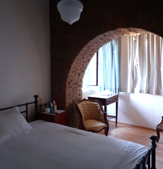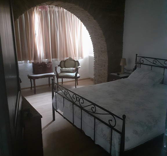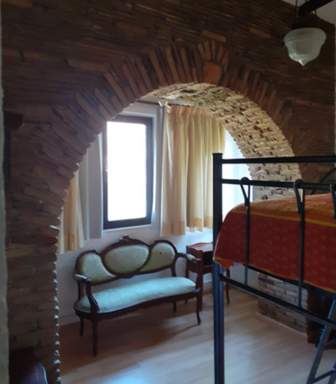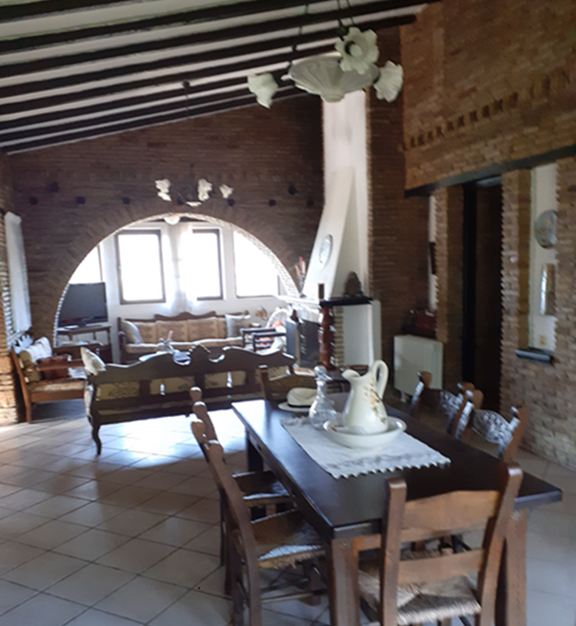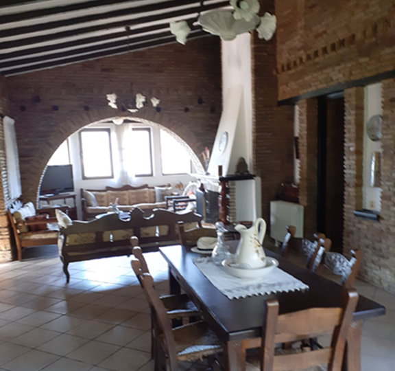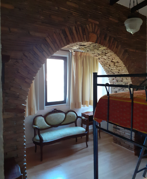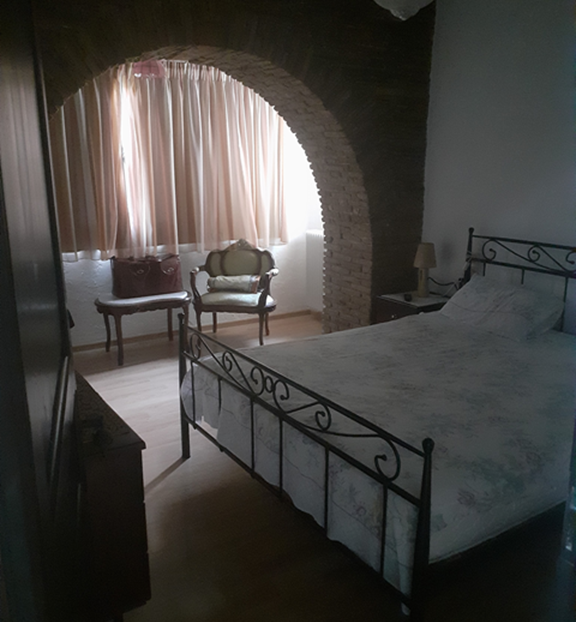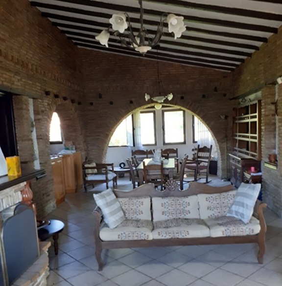 The main residence (132 m²) on the first floor features traditional architectural details, including exposed wooden beams and brick archways in the bedrooms. It offers three spacious bedrooms, a family bathroom, and a bright open-plan living area with large windows showcasing stunning mountain and countryside views. A sea-facing balcony provides a tranquil outdoor space to enjoy the scenery.